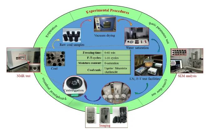 利用低場核磁共振技術,開展關于液氮凍結時間,凍融循環,煤體含水率和煤變質程度對凍融煤體物性改造規律的探索試驗。4種凍融變量對凍融煤體的孔隙結構、孔隙度和滲透率均具有不同的改造規律。其中凍融循環次數對煤體物性的改造尤為明顯。液氮對不同煤階煤體物性的改造規律受煤體初始孔隙度影響,一般情況下,改造效果為:褐煤>無煙煤>煙煤。以期獲得凍融變量對煤體孔隙結構和滲透率等物性參數的影響規律,為煤儲層的液氮循環壓裂技術提供數據支持。低場核磁共振技術在地質與礦業領域具有極大的應用前景和推廣價值,有望成為地礦領域的常規化和標準化設備。