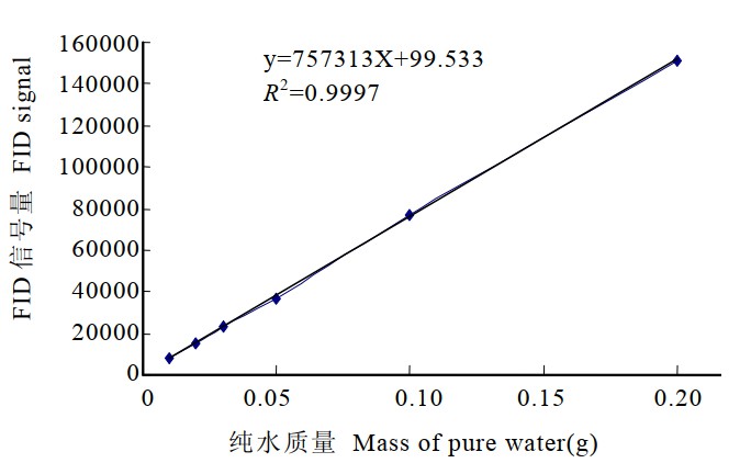 應用低場核磁共振測定茶葉的含水量,由于 FID 信號幅值與 H2O 中氫質子的密度成正比, 可以根據已知質量的水作為標樣定標,測其 FID 信號取幅值,擬合成曲線,再在相同條件下測一定質量茶葉樣的 FID 信號,根據擬合曲線計算出茶葉的含水量。將核磁共振法與國家標準的 103℃恒重法測得的數值進行對比, 分析核磁共振法測定茶葉含水量的準確性,穩定性等。
