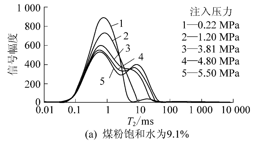 分析上圖可知,當飽和水煤粉浸沒在不同壓力的CO2中時,煤粉的核磁共振T2譜圖由初始飽和水的單峰結構變為明顯的雙峰結構。隨著CO2氣體壓力增大,吸附水峰面積減小,同時形成一個新的毛管束縛水峰,并逐漸向右偏移,即煤中吸附水轉變為毛管束縛水。當煤粉含水量增高,吸附水達到飽和的極限,多余的水則停留在毛管孔隙成為毛管束縛水。