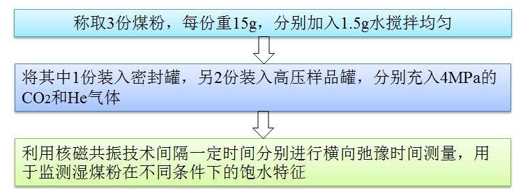 選取低階煤,鏡質組最大反射率為0.81%。試驗前,將煤樣磨制呈200~250μm,放入110℃的空氣干燥箱內干燥直至恒重,完成樣品的預處理。具體實驗流程如下圖所示。