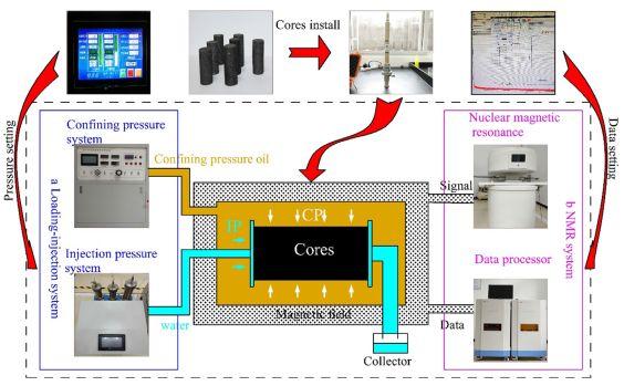 加載-注入核磁共振是研究模擬原位應力和連續注入環境下孔裂隙結構演化的重要技術。煤體孔裂隙結構通常通過氣體吸附、壓汞、小角x射線散射和掃描電鏡來研究,然而這些方法不能對樣品施加壓力。CT與微CT的分辨率稍顯不足。各方法對比如圖2。通過核磁共振研究實時孔徑分布較為簡單。然而單獨使用核磁共振觀測模擬原位應力和連續注入環境下的孔裂隙結構演化同樣不可能的,因此本文開發了加載-注入核磁共振系統,如圖3。煤芯最大直徑和長度分別為25.4mm和60mm。系統通過使用氟油對徑向施加圍壓,最大圍壓25MPa;最高溫度150℃;液體或氣體通過軸向注入煤芯。