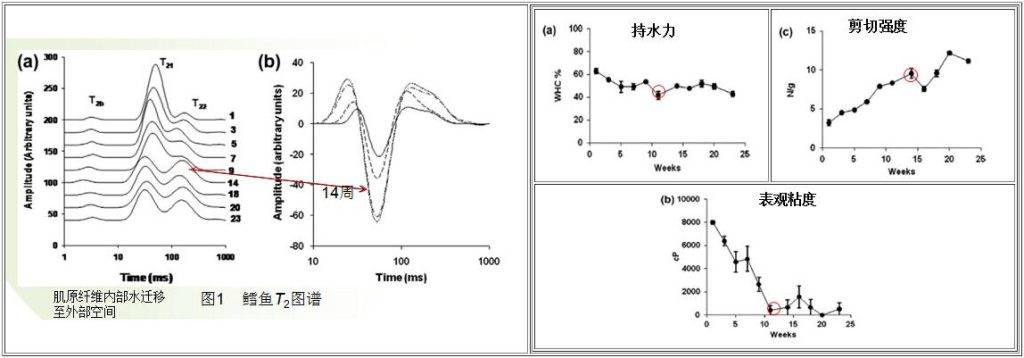 1.鱈魚在-10℃貯藏過程,肌原纖維內(nèi)部水分發(fā)生遷移,肌原纖維內(nèi)部及間隙中的水分轉(zhuǎn)移到外部空間,使得不易流動(dòng)水含量逐漸降低,自由水含量逐漸增加,在貯藏10-14week時(shí)自由水含量達(dá)到最大,而此時(shí)持水力和表觀粘度也同時(shí)達(dá)到最低,剪切力達(dá)到最大;