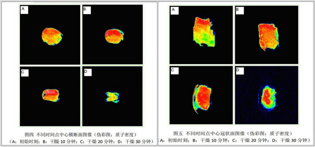 1.核磁共振成像中(圖四和圖五),顏色代表信號強(qiáng)度,紅色信號越大,氫質(zhì)子密度越大,藍(lán)色信號越大,氫質(zhì)子密度越小,通過核磁共振成像可明顯看出不同干燥時(shí)段水分的分布及變化;