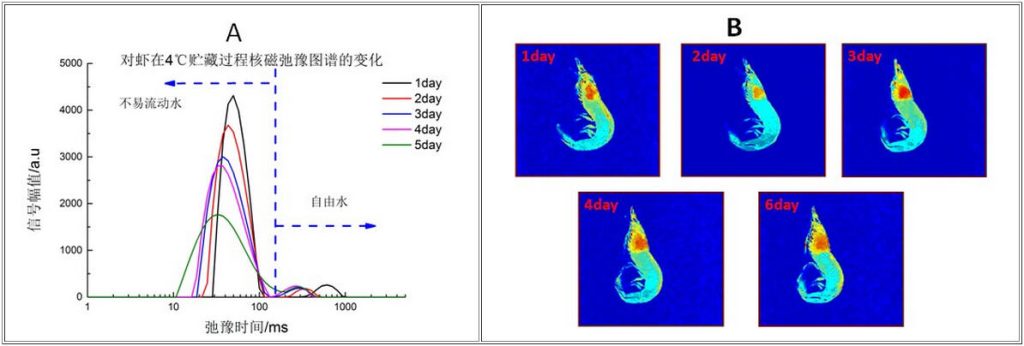 (A)對蝦4℃貯藏過程核磁共振T2弛豫圖譜的變化;(B)不同貯藏時(shí)間的核磁共振質(zhì)子密度相;