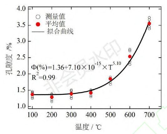 從上圖可以看出,核磁共振孔隙度與溫度之間的變化規(guī)律,與T2譜面積變化規(guī)律相似,在高于500℃時,內(nèi)部結(jié)構(gòu)變化顯著,均呈現(xiàn)為冪律函數(shù)形式增加。