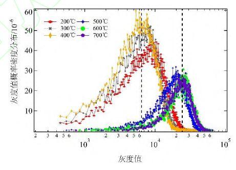 上圖為不同溫度花崗巖試樣像素值的概率密度函數(shù)分布圖,所有對應(yīng)溫度下的成像分布遵循對數(shù)正態(tài)分布。隨溫度升高,曲線向右大幅度移動,較大像素值增加,巖石內(nèi)部損傷加劇,概率密度峰值所對應(yīng)的像素值增大并向右轉(zhuǎn)移,像素分布遷移規(guī)律與T2譜圖分布變化特征一致,能定量表示花崗巖在高溫作用下內(nèi)部結(jié)構(gòu)損傷過程。