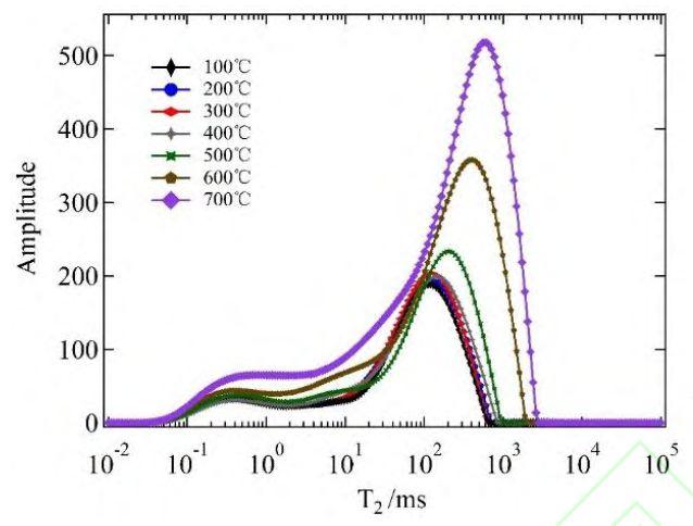 從不同溫度下的T2譜圖中可以看出,T2圖譜表現(xiàn)為雙峰特性,其中較低的峰值范圍主要在10ms以內(nèi),大于10ms以上的孔徑范圍信號幅值偏大,即孔隙主要集中在該范圍內(nèi)。低于400℃以下的圖譜雙峰形態(tài)和走勢一致,譜曲線基本重合,表明加熱溫度低于400℃時,溫度對花崗巖內(nèi)部的微觀結(jié)構(gòu)影響極小。