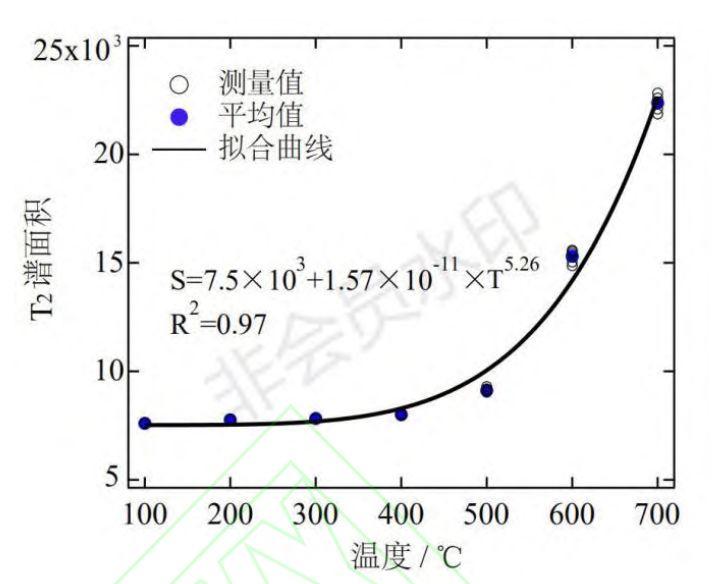 (1)核磁共振T2譜圖在低于400℃以下時沒有明顯變化,當(dāng)溫度高于500℃時,T2圖譜幅值顯著增加且向右大幅移動,T2譜面積與孔隙率在升溫過程中呈現(xiàn)冪率關(guān)系。