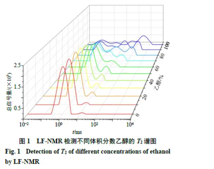 低場(chǎng)核磁共振時(shí)域技術(shù)(low-fieldnuclear magnetic resonance time domain technique,LF-NMR)和低場(chǎng)核磁成像技術(shù)(low-fieldnuclear magnetic resonance imaging,LF-MRI)是對(duì)處于恒定磁場(chǎng)中的樣品施加頻率匹配的射頻脈沖,使質(zhì)子從低能態(tài)躍遷至高能態(tài),質(zhì)子再以非輻射的方式釋放能量并返回到低能態(tài),發(fā)生核磁共振。通過(guò)分析自旋弛豫特性反映質(zhì)子的運(yùn)動(dòng)性質(zhì),進(jìn)而從微觀的角度解釋樣品的物理化學(xué)環(huán)境等內(nèi)部信息。不同體積分?jǐn)?shù)乙醇溶液是中藥制粒中常用的潤(rùn)濕劑,其含有大量的質(zhì)子,可通過(guò)LF-NMR測(cè)定潤(rùn)濕劑質(zhì)子濃度、運(yùn)動(dòng)狀態(tài),進(jìn)而分析潤(rùn)濕劑的含量和潤(rùn)濕劑在顆粒中的分布狀態(tài)。該技術(shù)具有快速、無(wú)損、測(cè)得數(shù)據(jù)準(zhǔn)確,且無(wú)需添加化學(xué)試劑即可測(cè)定樣品水分變化等優(yōu)點(diǎn),現(xiàn)已廣泛應(yīng)用于食品、炮制等工業(yè)中[8-9]。劉佳佳等[10]使用LF-NMR研究浸膏粉的吸濕過(guò)程;吳雙雙等[11]用于研究顆粒的含水量及水分的相態(tài)分布,這些研究都用于研究水分的變化,并未見(jiàn)對(duì)制粒中乙醇研究的變化相關(guān)報(bào)道。