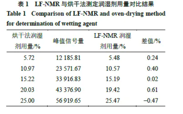 3.1.7 準(zhǔn)確性實(shí)驗(yàn) 按“2.2.1”項(xiàng)方法對(duì)5個(gè)待測(cè)樣品的潤(rùn)濕劑用量進(jìn)行LF-NMR檢測(cè),并與烘干法測(cè)定的結(jié)果進(jìn)行比對(duì),結(jié)果見(jiàn)表1。由表1可看出,LF-NMR與烘干法測(cè)定的結(jié)果差值均小于1%,說(shuō)明所建立的LF-NMR具有較好的準(zhǔn)確性。