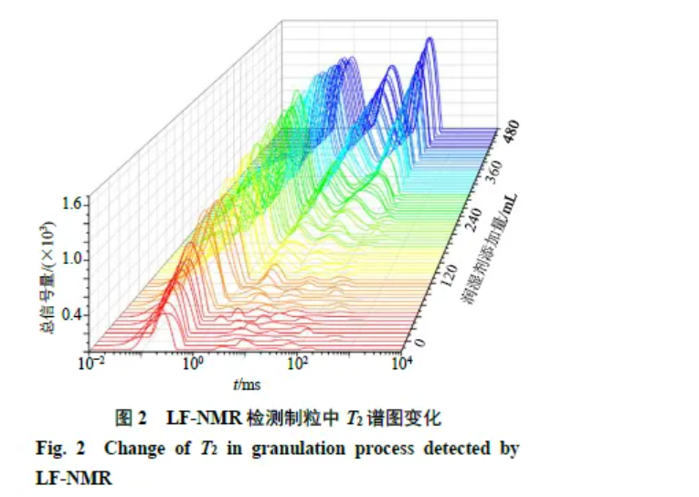 2.2.1 LF-NMR檢測(cè)參數(shù) 取“2.1”項(xiàng)下備用濕顆粒2 g,移入φ 26 mm的核磁共振樣品管,再將樣品管放置于探頭中,儀器磁體溫度為(32.00±0.02)℃,儀器共振頻率為20.679 MHz。然后采用CPMG采集樣品信號(hào),序列參數(shù)設(shè)置:采樣頻率(SW)200 kHz,硬脈沖90°脈寬(P1)6.52 μs,硬脈沖180°脈寬(P2)11.52 μs,重復(fù)采樣等待時(shí)間(TW)1000 ms,重復(fù)采樣次數(shù)(NS)128次,回波時(shí)間(TE)0.1 ms,回波個(gè)數(shù)(NECH)5000。