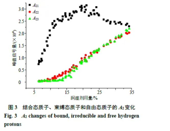 由圖3可知,隨著潤(rùn)濕劑的添加,結(jié)合態(tài)質(zhì)子逐漸增加,A22峰值信號(hào)量在潤(rùn)濕劑10%時(shí)開(kāi)始逐漸增加,A23峰值信號(hào)量則當(dāng)潤(rùn)濕劑在15%時(shí)開(kāi)始逐漸增加,說(shuō)明水分逐漸增加且不斷向表面滲透。當(dāng)潤(rùn)濕劑在20%~25%時(shí),結(jié)合態(tài)質(zhì)子處于穩(wěn)定狀態(tài);當(dāng)達(dá)到25%后,A21峰值信號(hào)量逐漸下降,可能是隨著潤(rùn)濕劑的添加,結(jié)合態(tài)質(zhì)子在顆粒中的束縛力減少,或在濕顆粒中結(jié)合態(tài)質(zhì)子達(dá)到了飽和狀態(tài),使部分結(jié)合態(tài)質(zhì)子向非結(jié)合態(tài)質(zhì)子轉(zhuǎn)變。當(dāng)呈現(xiàn)“泥漿”狀態(tài)時(shí),即潤(rùn)濕劑達(dá)到34%左右時(shí),結(jié)合態(tài)質(zhì)子、束縛態(tài)質(zhì)子和自由態(tài)質(zhì)子3種狀態(tài)的態(tài)質(zhì)子分趨于一定值。