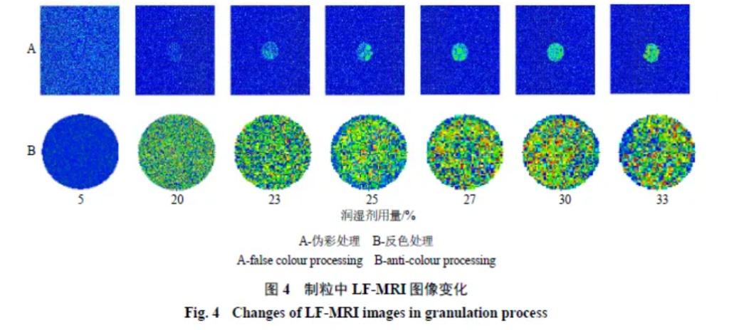 對(duì)掃描的圖像進(jìn)行反色處理后可以看出潤(rùn)濕劑用量在20%時(shí)已出現(xiàn)紅色,但以綠色為主,說(shuō)明非結(jié)合態(tài)潤(rùn)濕劑量較低。制粒后期,顏色主要以紅色和黃色為主(圖4-B),說(shuō)明濕顆粒中潤(rùn)濕劑過(guò)量。由此可見(jiàn)LF-MRI成像中,根據(jù)質(zhì)子密度變化,可以直觀表征制粒中顆粒內(nèi)部的潤(rùn)濕劑變化,也可觀察到潤(rùn)濕劑均勻分布情況。