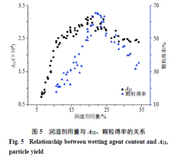 研究表明,當(dāng)顆粒的含水量達(dá)到一定的范圍時(shí),會(huì)發(fā)生明顯的團(tuán)聚現(xiàn)象;低于范圍粉體的黏結(jié)性較小,高于一定范圍會(huì)出現(xiàn)“過(guò)制粒”[13]。由圖5可知,在潤(rùn)濕劑用量較低時(shí),顆粒得率也低,這可能與細(xì)粉的比表面積有關(guān)[14],細(xì)粉粒徑越小比表面積越大,接觸到潤(rùn)濕劑的面積增大;在前期添加潤(rùn)濕劑后,潤(rùn)濕劑與粉末緊密結(jié)合成結(jié)合態(tài)質(zhì)子,所以在顆粒增長(zhǎng)的前期,需要較多的潤(rùn)濕劑對(duì)顆粒的表面進(jìn)行潤(rùn)濕[6],形成母核后合并或包裹。當(dāng)潤(rùn)濕劑達(dá)到20%~25%時(shí),顆粒得率達(dá)到最高,之后顆粒得率逐漸下降(將A21與顆粒得率進(jìn)行相關(guān)性分析,P<0.05),分析可能是由于潤(rùn)濕劑達(dá)到25%時(shí),濕顆粒內(nèi)部的結(jié)合態(tài)質(zhì)子達(dá)到飽和,逐漸向非結(jié)合態(tài)質(zhì)子轉(zhuǎn)化,隨著濕顆粒表面非結(jié)合態(tài)質(zhì)子增多,使?jié)耦w粒的黏結(jié)性增大更容易聚集、包覆,直至出現(xiàn)大團(tuán)塊,而且隨著非結(jié)合態(tài)質(zhì)子持續(xù)增多,大團(tuán)塊進(jìn)一步變成“泥漿狀”。