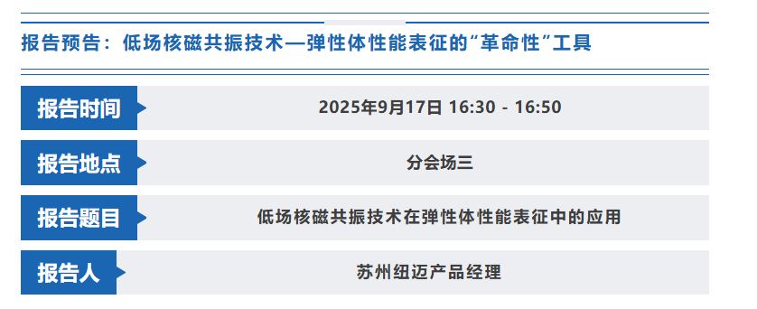 2025年9月17日下午16:30-16:50,分會(huì)場(chǎng)三,蘇州紐邁期待與您相遇,共同探討低場(chǎng)核磁共振技術(shù)的無(wú)限可能,攜手推動(dòng)彈性體材料邁向更高性能、更綠色智能的未來(lái)!