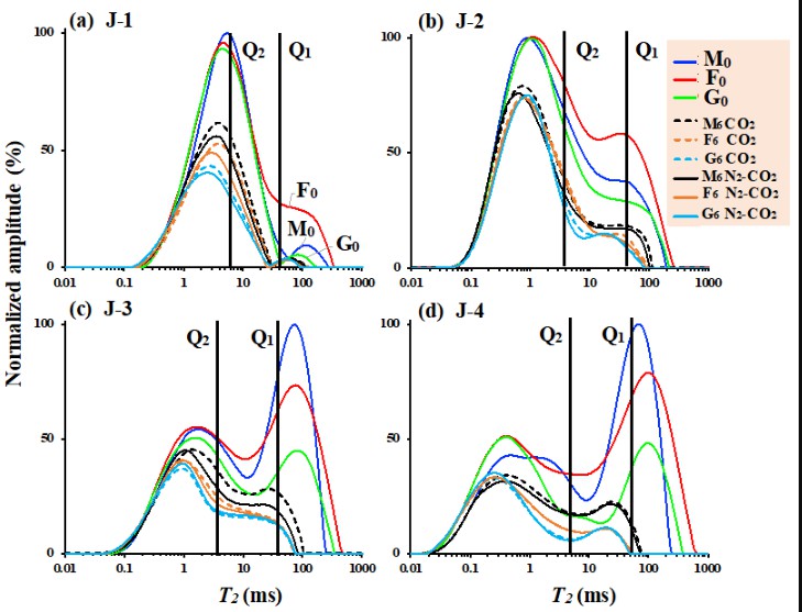圖2.壓裂前樣品飽和輕油T2譜(J-1和J-2取自吉木薩爾凹陷,J-3和J-4取自西湖凹陷)