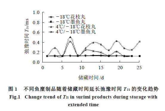核磁共振技術是一種無損、快速的監測手段,可從分子水平來研究魚糜制品儲藏過程的水分分布及其狀態,直觀地顯示食品中水分及其遷移狀態。國外已將核磁共振技術應用于食品加工與儲藏多方面。