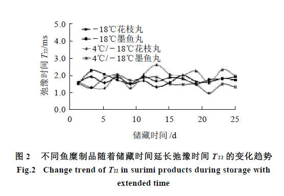 這部分水與弛豫時間為T21 的水分特性相同,水的結合力都很強,在魚糜制品中結合緊密。但T22 的結合力比T21 稍弱,這部分水與蛋白質中的酰胺基、淀粉纖維素中的羥基形成較小的氫鍵。其結合強度比單分子層水要略差些