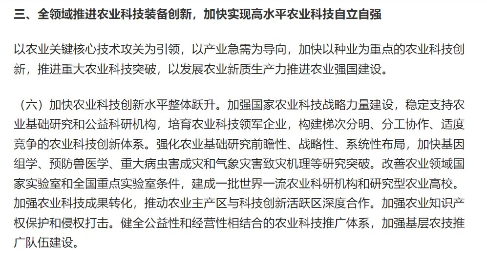 近日,中共中央、國務院印發的《加快建設農業強國規劃(2024-2035 年)》在農業領域引發廣泛關注。該規劃明確指出,要全領域推進農業科技裝備創新,將加快實現高水平農業科技自立自強作為核心任務。