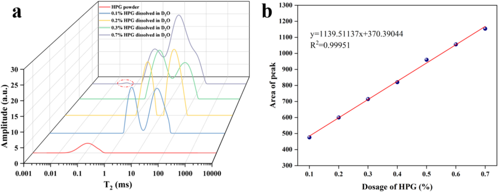 圖1:羥丙基瓜爾膠基流體在0.1–0.7%瓜爾膠濃度下:(a) 弛豫分布;(b) T2峰總面積與瓜爾膠用量的關(guān)系
