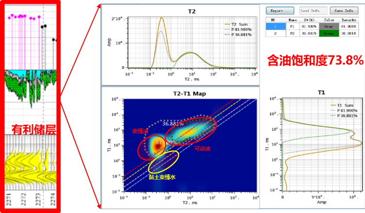 以上為油田現場頁巖油儲層的一口預生產井,通過井場全直徑核磁實驗分析,確定了有利儲層段:一維核磁確定雙峰T2譜為有利儲層,大孔隙發育良好,孔隙度為7.51%,二維核磁確定的含油飽和度為73.8%。該數據為油井開發提供了及時可信的巖石物理實驗依據。