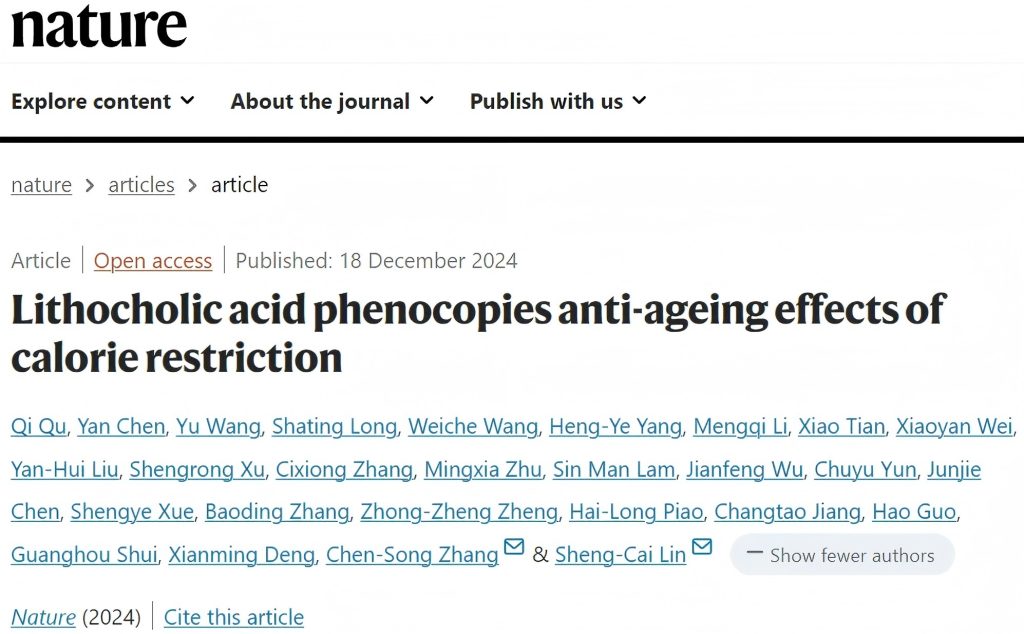 2024年12月18日,廈門大學林圣彩院士團隊在國際頂級期刊《Nature》發表題為“Lithocholic acid phenocopies anti-ageing effects of calorie restriction”的研究論文,該研究發現石膽酸表型模仿卡路里限制的抗衰老作用。研究人員使用代謝組學來分析在CR期間豐度發生變化的代謝物,并進行后續的功能驗證。研究發現,石膽酸(LCA)是一種代謝產物,單獨使用可以重現CR在小鼠中的作用。這些作用包括激活AMP-活化蛋白激酶(AMPK)、增強肌肉再生以及恢復握力和跑步能力。LCA還激活AMPK,并誘導秀麗隱桿線蟲和黑腹果蠅的壽命延長和健康延長效應。作為C.elegans和D.黑腹果蠅不能合成LCA,這些結果表明,一旦施用,這些動物就能夠傳遞LCA的信號傳導效應。在所有三種動物模型中,AMPK的敲除消除了LCA誘導的表型。總之,該研究確定了單獨施用CR介導的上調代謝物LCA可以AMPK依賴性方式賦予后生動物抗衰老益處。