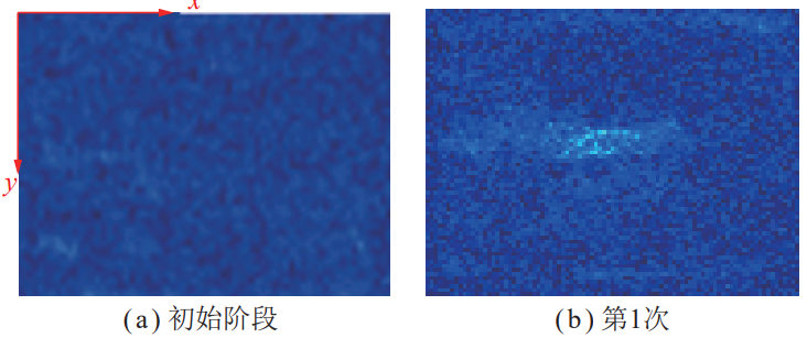 階段Ⅰ,由于煤樣較為致密,孔隙率較低,初始階段煤樣內部各區域信號響應非常微弱,如圖九(a)~ (c) 所示。震動載荷沖擊產生的震動波從高波阻抗的桿件傳入低波阻抗的煤樣,波形發生多次偏轉,在此過程中煤基質產生破壞形成新的吸附孔,煤樣內形成少量損傷區域,呈現點狀分散分布。