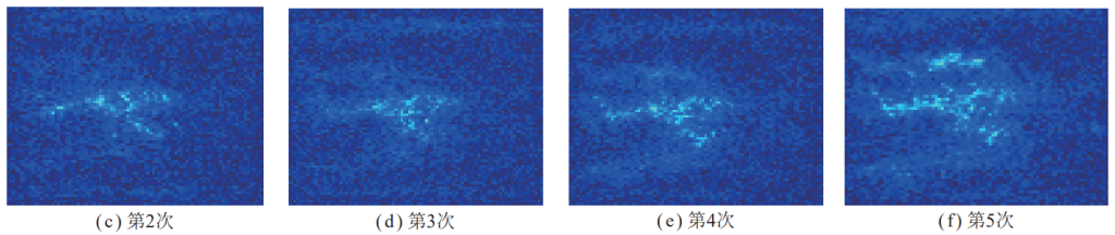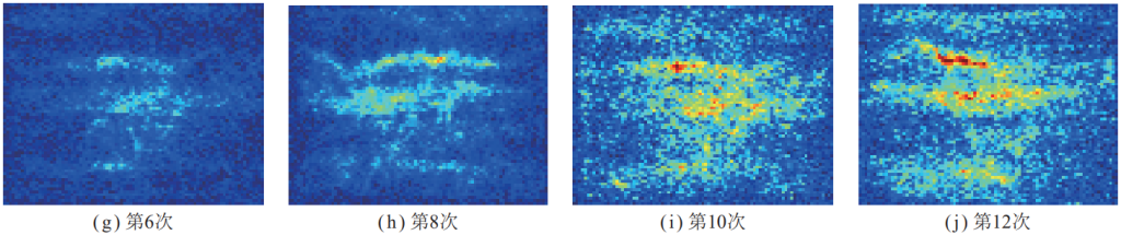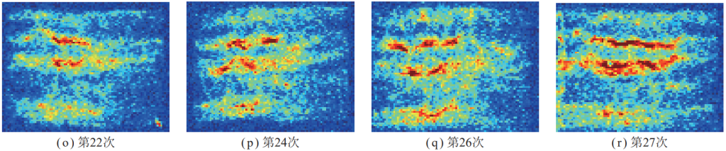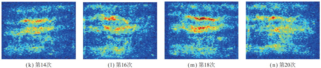 階段Ⅱ,隨著震動載荷沖擊次數的增加,滲流孔開始逐步增多,損傷區域信號響應增強,并出現由點狀分散分布向條狀集中分布的趨勢,如圖九(d)~(g)所示。