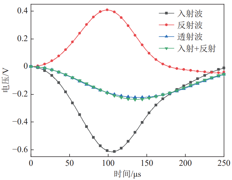 在煤體受到震動載荷沖擊后,入射波應力和反射波應力之和與透射波應力近似相等,能夠較好地滿足應力平衡條件,證實了煤樣在震動載荷作用過程中符合應力均勻性的假設,如圖三所示。