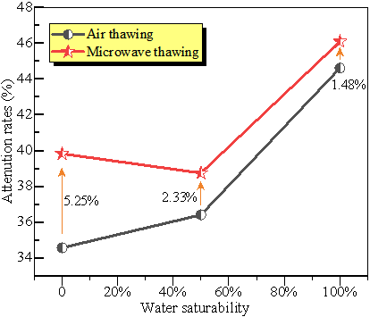 圖七給出了試樣的波速衰減情況。可以看出,隨著試樣飽和度的增加,空氣解凍煤試樣波速的損傷因子增大,說明飽和度有利于煤的液氮壓裂。這與滲流孔增長率結(jié)果相似。在相同飽和度下,微波解凍煤樣的損傷因子大于空氣解凍煤樣的損傷因子,在低飽和度煤特別明顯。