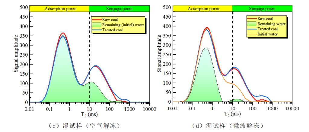 煤層氣的收集是在采煤前進行的,既保證了開采安全,又提供了能源。然而,煤儲層滲透率低,阻礙了煤層氣的大量、連續(xù)的開采。為提高儲層滲透率,采用了水力壓裂等增產(chǎn)手段。水力壓裂需要大量的水,這造成寶貴能源消耗、缺水地區(qū)污染環(huán)境、誘發(fā)地震。由于這些問題,無水壓裂方法(比如,液氮壓裂)被認為是一種經(jīng)濟環(huán)保的技術(shù)。液氮壓裂包括凍結(jié)和解凍。然而,目前的研究人員認為融化對被測樣品的影響很少或是整個壓裂過程中可以忽略的一部分。常規(guī)液氮壓裂的融化階段(空氣解凍階段)對壓裂效果的影響不大,且影響主要集中在孔隙結(jié)構(gòu)上。然而,巖石滲透性的提高不僅取決于孔隙結(jié)構(gòu),還取決于含水率等水分條件。為了進一步提高液氮的刺激效果,我們提出了用微波代替空氣解凍冷凍煤的新方法。壓裂效應主要體現(xiàn)在孔隙結(jié)構(gòu)演化和水分變化上面。因此,對處理過程中對孔隙結(jié)構(gòu)演化和水分變化定量描述尤為重要。低場核磁共振可以在處理前后無損的反映試樣的孔隙結(jié)構(gòu)。通過分析T2譜,系統(tǒng)地研究了微波輻射對液氮凍結(jié)煤的壓裂效應。這項研究展示了不同含水率煤樣在液氮微波聯(lián)合作用下的孔隙結(jié)構(gòu)和溫度響應。