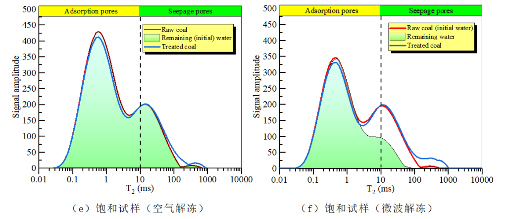 作者在實驗前后和處理過程利用低場核磁技術(shù)測定了煤試樣的T2譜曲線。圖二繪制了煤試樣的T2譜曲線。凍融處理后試樣(處理煤)T2曲線右移,第二峰振幅增大。這些變化說明處理后煤孔隙的大小和數(shù)量都有所增加。此外,微波解凍對試樣T2譜的增強作用比空氣解凍更明顯。這表明與空氣解凍相比微波解凍對煤孔隙結(jié)構(gòu)的破壞更為有效。煤樣孔隙分為微孔、中孔和大孔(或裂紋),對應的T2大小范圍分別為