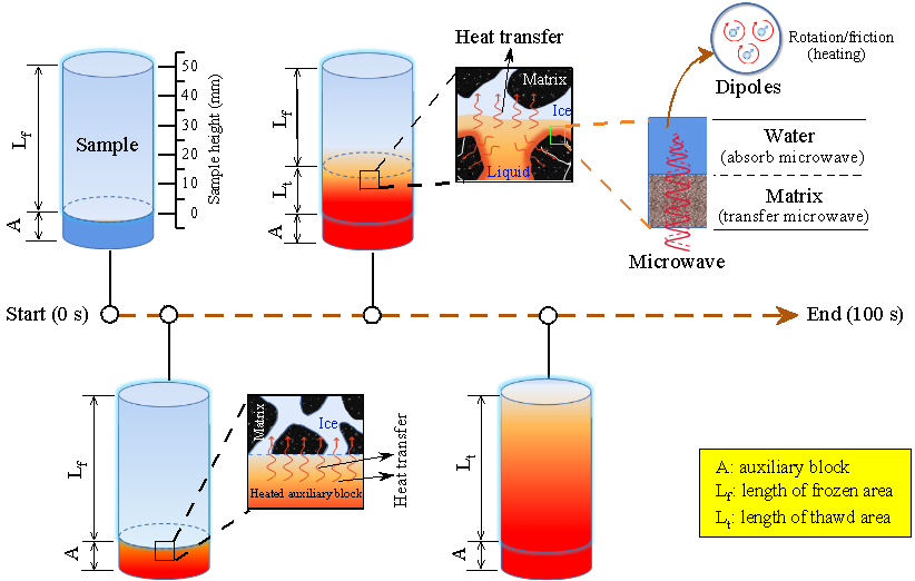 (5) 凍結(jié)的樣品立即在5千瓦的微波爐中解凍100秒。請注意,在冷凍樣品的一端放置一個接近環(huán)境溫度(18.5℃)的飽和水輔助塊,以促進解凍,如圖一所示。