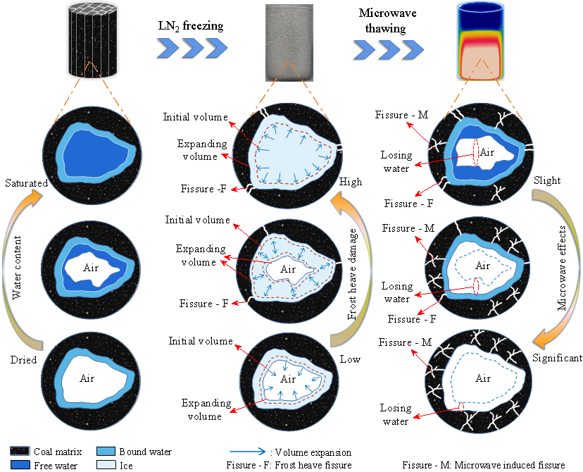 在液氮壓裂機制中,低溫凍結(jié)產(chǎn)生的凍脹力是造成含水煤試樣凍融破壞的主要原因。如圖四所示,低含水飽和度的試樣孔隙為水冰相變提供了額外的擴展空間,降低了凍脹效應。通常,液氮對煤樣的破壞程度隨著含水飽和度的增加而增加。這就是為什么液氮凍結(jié)效果在100%飽和試樣而不是50%飽和試樣中表現(xiàn)良好的原因。由于微波的選擇性加熱,并且煤各元素之間的熱效應是不均勻的,會對煤產(chǎn)生熱應力。另外,由于微波過程中溫度升高水的氣化在煤孔隙中形成的高壓蒸汽同樣促進孔隙/裂紋的擴展和相互連通(圖四)。所以,微波解凍后孔隙結(jié)構(gòu)再次得到提高。這種提高程度與含水率成負相關。微波解凍后干燥試樣、濕試樣和飽和試樣的T2曲線面積分別減小了21.46%、44.85%和21.31%。說明微波解凍后煤樣內(nèi)部的部分孔隙水去除。