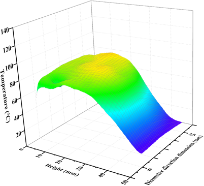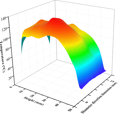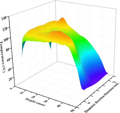 圖六給出了微波解凍后煤樣的表面溫度分布,其中較深的顏色(紅色)代表高溫,較淺的顏色(藍色)代表低溫。靠近輔助塊的區(qū)域(高度0mm-30mm)溫度高于遠離輔助塊的區(qū)域高度(30 mm -50mm)溫度。試樣沿高度方向有明顯的溫度梯度,特別是在30mm-50mm高度區(qū)域范圍內(nèi)。同樣的,這是由圖一介紹的解凍方式?jīng)Q定的,沿高度方向?qū)υ嚇拥慕鈨觯斐蓽囟仍诟叨确较虻姆植疾町悺Ec飽和試樣相比,濕飽和試樣輔助塊附近區(qū)域的表面溫度分布更加不均勻,出現(xiàn)許多紅色突出區(qū)域,溫度在120℃-140℃左右。這說明當煤樣飽和度較低時,容易出現(xiàn)高溫區(qū)。從整體的溫度來看濕試樣相對于干試樣和飽和試樣要高。