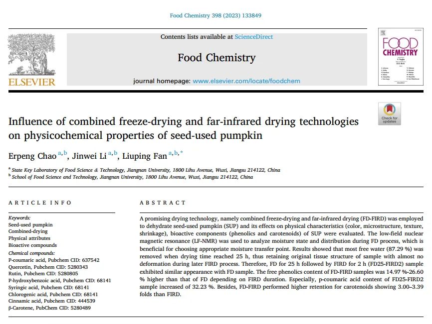 研究人員采用了一種很有前景的干燥技術,即冷凍干燥和遠紅外干燥(FD-FIRD)聯合技術,對種子用南瓜(SUP)進行脫水,并評估了其對南瓜的物理特性(顏色、微觀結構、質地、收縮率)、生物活性成分(酚類和類胡蘿卜素)的影響。低場核磁共振(LF-NMR)用于分析脫模過程中的水分狀態和分布,這有利于選擇合適的水分轉移點。結果表明,當干燥時間達到 25 小時時,大部分游離水(87.29%)被去除,從而保留了樣品的原始組織結構,在后期的熱固性脫脂過程中幾乎沒有變形。因此,干燥 25 小時后再進行 2 小時熱固性脫脂(FD25-FIRD2)的樣品與干燥脫脂樣品的外觀相似。FD-FIRD 樣品的游離酚含量比 FD 樣品高 14.97 %-26.60 %,這取決于 FIRD 的持續時間。特別是 FD25-FIRD2 樣品的對香豆酸含量增加了 32.23%。此外,FD-FIRD 的類胡蘿卜素保留率比 FIRD 高 3.00-3.39 倍。