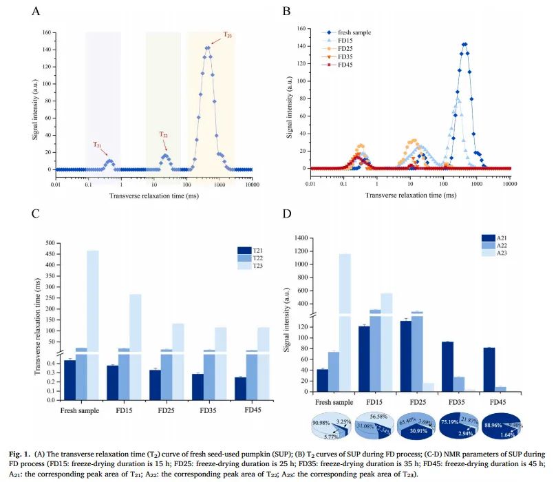 圖1. ?(A) 鮮種用南瓜(SUP)的橫向弛豫時間(T2)曲線;(B) 南瓜在凍干過程中的 T2 曲線;(C-D) 南瓜在凍干過程中的 NMR 參數(FD15:凍干時間為 15 小時;FD25:FD35:冷凍干燥持續時間為 35 小時;FD45:冷凍干燥持續時間為 45 小時;A21:T21 對應的峰面積;A22:T22 對應的峰面積;A23:T23 對應的峰面積)
