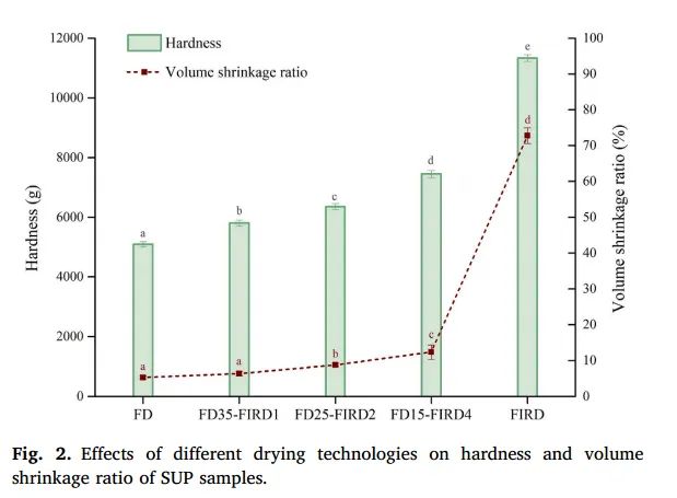 圖2.? 不同干燥技術對 SUP 樣品硬度和體積收縮率的影響