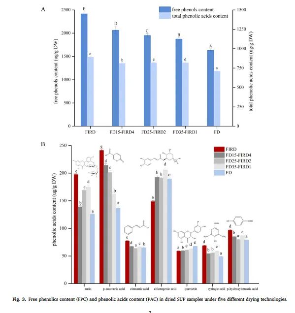 在 FD、FIRD 和 FD-FIRD 產品中鑒定出以下七種酚酸:對香豆酸、綠原酸、對羥基苯甲酸、蘆丁、丁香酸、肉桂酸和槲皮素(圖 3B)。對香豆酸是所有干 SUP 樣品中檢測到的最主要的酚酸,其中 FIRD 樣品中的含量最高(241.50 ± 0.88 μg/g DW)。值得注意的是,香豆酸的含量似乎與 FIR 的暴露時間呈正相關:FD15-FIRD4(4 小時)為 214.27 ± 0.45 μg/g DW,FD35-FIRD1(1 小時)為 162.28 ± 0.43 μg/g DW。原因之一是 FIR 可誘導對香豆酸和半纖維素之間的酯鍵分解。另一個原因是對香豆酸具有良好的熱穩定性。此外,FD35-FIRD1 的綠原酸含量最高(206.13 ± 3.61 μg/g DW),這與脫脂過程中氧引起的氧化反應減少有關。根據先前的研究,由于存在易氧化和不穩定的酯鍵以及不飽和雙鍵,高干燥溫度和富氧環境可能會誘發綠原酸的異構化。同時,FD 樣品與 FIRD 樣品相比,槲皮素含量增加了 1.14 倍。有趣的是,與 FIRD 樣品中的蘆丁含量相比,FD15-FIRD4 中的蘆丁含量明顯下降了 72%,其次是 FD25-FIRD2(61%)和 FD35-FIRD1(55%)。蘆丁含量的這種變化可能是由于脫脂過程結束時的殘余水含量造成的。Ranieri 等人(2019 年)也曾發現,脫水過程結束時的殘余水分含量會影響接下來干燥過程中蘆丁含量的變化,且較高的殘留水分會導致蘆丁的損失。如上所述,酚酸含量受到不同干燥技術不同程度的影響,這可能是由于干燥過程中酚酸與其他化合物(即果膠、纖維素和蛋白質)之間的相互作用發生了變化或酚酸的結構發生了變化。此外,在保存 SUP 的酚類化合物方面,FD-FIRD 是一種可行的替代方法,甚至可能優于 FIRD。