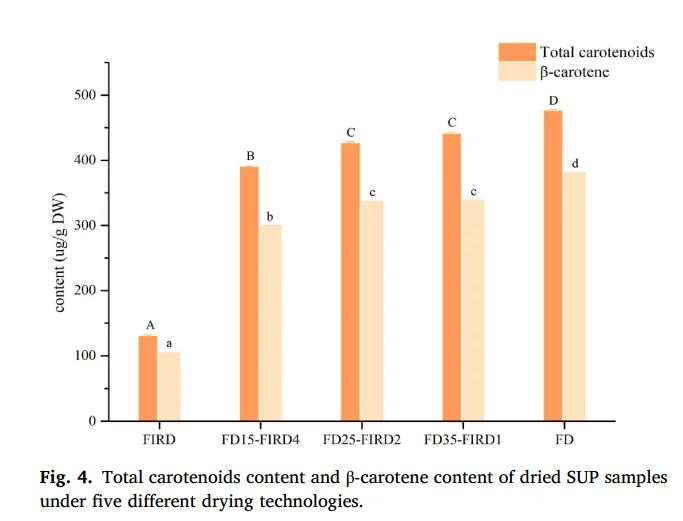 圖4.?五種不同干燥技術下干燥的 SUP 樣品的類胡蘿卜素總含量和?β-胡蘿卜素含量