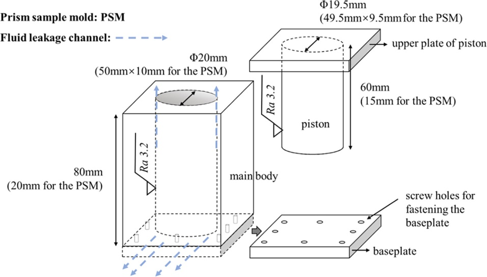 在這項工作中使用兩種鋼模具,一種是圓腔部分(ф20毫米),另一種是矩形腔部分(50毫米×10毫米),用于制備C-S-H塊樣品。模具的結構如下圖所示。樣品完成擠壓后,導出模具,并放置在密封室架子上,架子下有足夠的去離子水,使其完全濕潤。制備了三組C-S-H樣品,標記為C09H、C12H和C15H,原材料配方中的Ca/Si比率為0.9、1.2和1.5,樣品的測量體積密度為1.69g/cm3。對于Ca/Si比為0.9的配方,再制備一個C-S-H樣品,表示為C09L,測量的體積密度為1.50g/cm3。