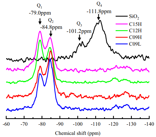 如圖3所示,硅核磁共振被用來接收更多關于所獲得的C-S-H樣品結構的信息。對于SiO2,觀察到兩個峰值,分別為-101.2ppm的Q3和-111.8ppm的Q4。對于C-S-H樣品,檢測到另外的兩個峰值,分別為-79.0ppm的Q1和-84.8ppm的Q2,而Q3和Q4信號發生消失,表明完全消耗掉了SiO2。
