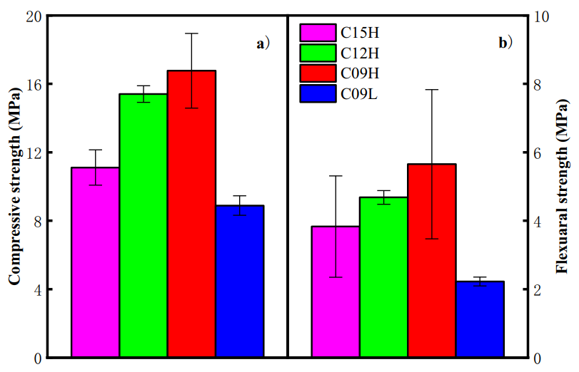 在標準固化條件下進行6個月的固化后,塊狀樣品直接用于機械測試,無需進一步處理。圓柱體樣品的壓縮強度由電子萬能試驗機進行測試。加載率被設定為0.3毫米/分鐘。用三點彎曲法測試了圓柱體樣品的柔性強度。