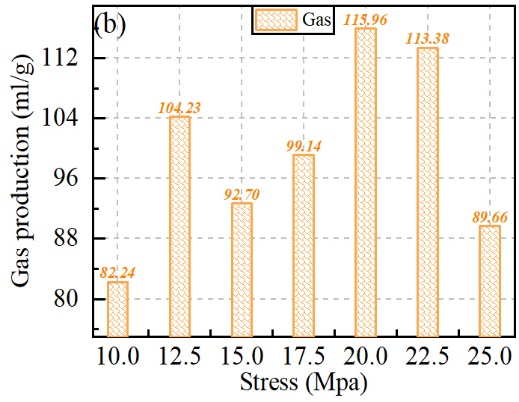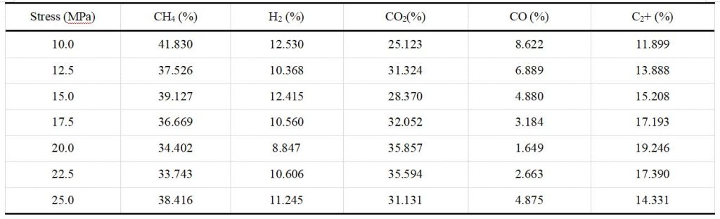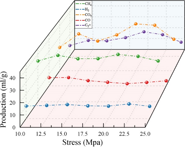 20-25.0MPa,各氣體組分的產量與10-17.5MPa表現出截然相反的趨勢,CO的產量隨應力的增大逐漸增大,其余各類氣體則逐漸減少。其中CO2產量減少13.668ml/g,CH4減少5.449ml/g,C2+烴類氣體減少