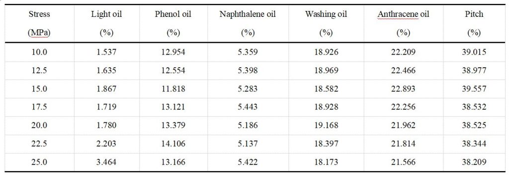 20MPa,輕油產率增大了1.608倍,而酚油、萘油、洗油、蒽油和瀝青則僅為前者的0.824、0.874、0.794、