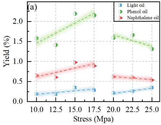 熱解焦油中瀝青、蒽油及洗油等重質餾分的產率相對較高,而輕油、酚油和萘油等輕質餾分的產率則相對較低(圖9)。盡管各餾分產率存在差異,但其隨應力的演化總體上可劃分為兩個階段。10-17.5MPa,各餾分產率隨著應力的增大整體呈增大趨勢,而且重質餾分較輕質餾分變化幅度更為明顯。然而,就增長倍數而言,輕質餾分要高于重質餾分。具體表現為:輕油、酚油及萘油的增量分別為1.492倍、1.361倍及1.365倍;洗油、蒽油和瀝青的增量則分別為1.328倍、1.347倍及1.344倍。此階段,應力升高增強了孔裂隙的連通性,促進了熱解時煤中橋鍵的斷裂以及脂肪和含氧等結構的裂解[42],形成的大量自由基碎片聚合形成焦油分子,從而增大了焦油各餾分的產率。此外,各餾分增長的差異性歸因于該階段各餾分占比的不同。隨著應力增至15MPa,蒽油與瀝青的相對含量逐步上升,而酚油及洗油的相對含量則持續下降,輕油與萘油的比例變化微弱。該現象可歸因于煤體內部發達的孔裂隙結構,使得熱解過程中揮發物的釋放難度降低,從而減少了其在煤體內部的停留時間,二次反應減弱。相較15.0MPa,17.5MPa瀝青與蒽油的占比急劇降低,而酚油及洗油的占比逐漸增大。該現象進一步驗證了3.3節所述,17.5MPa下焦油產率降低系由大分子焦油裂解轉化為小分子焦油所致。
