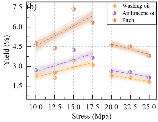 圖9煤焦油各餾分產率與應力的關系(a.輕質餾分;b重質餾分)