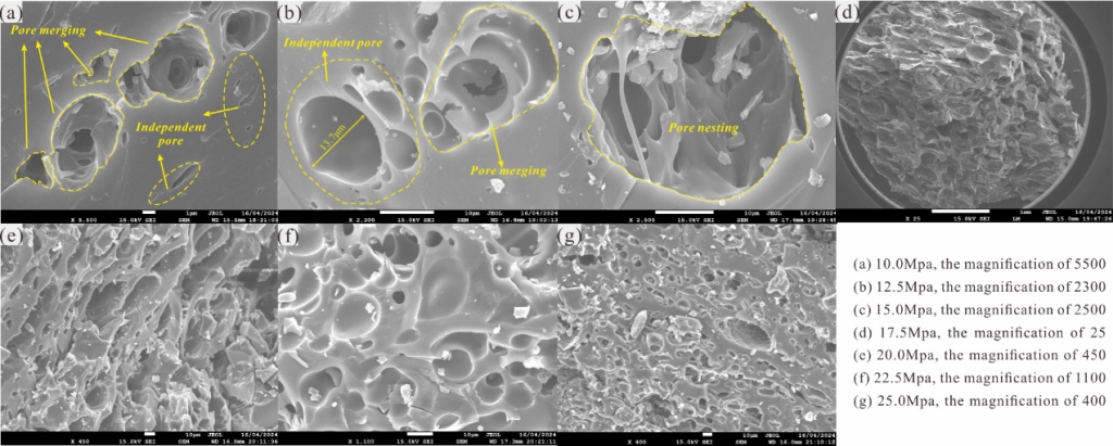 15.0MPa熱解煤樣中的氣孔合并的現象更為顯著,獨立的氣孔不斷擴大,隨后相鄰的孔隙壁不斷變薄甚至消失,最后孔隙之間發生合并甚至嵌套現象(圖3c)。17.5MPa熱解煤樣中孔隙極為發育,在放大25