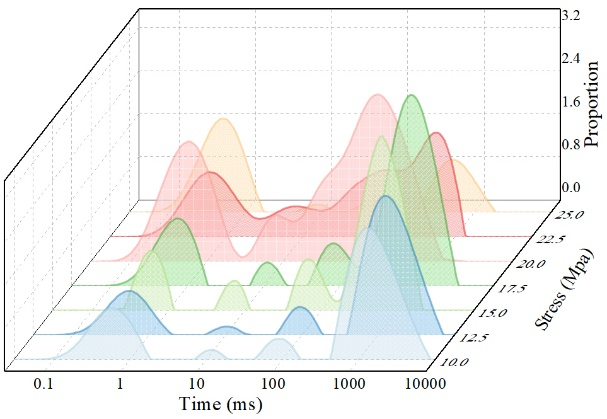 為充分對比不同應力熱解下煤樣的孔隙分布特征,將低場核磁共振T2譜數據進行體積歸一化處理。總體而言,不同應力熱解后煤樣的T2譜曲線普遍呈現四峰分布(圖4),其中峰1分布范圍為0.01-3ms、峰2(3ms-10ms)、峰3(10-170ms)和峰4(>170ms)。熱解煤樣的T2譜曲線在應力范圍10.0-17.5MPa和20.0-25.0MPa存在不同。10.0-17.5MPa應力范圍內,熱解煤樣T2譜的峰1的變化較小,峰1和峰2不連續,表示孔隙間連通性較差。應力增加使T2譜的峰2、峰3和峰4總體均呈增大的趨勢。其中峰4的面積相比其他峰,占據著顯著的地位。在12.5MPa后T2譜的峰3和峰4的連續性逐漸好轉,并且峰位逐漸向左移動,表明孔徑逐漸變小。20.0-25.0MPa,隨著應力的增大,熱解煤樣T2譜的峰1面積呈現先減小后增大趨勢,而峰2,峰3和峰4則持續減小。并且峰1和峰2的間距逐漸減小,指示了孔隙間連通性在逐漸變差。
