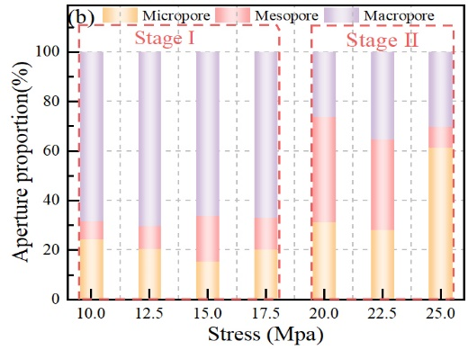 眾多學者對孔徑和弛豫時間的關系進行了深入研究,認為T2<3ms指示的孔隙屬微孔,3ms<T2<170ms屬中孔,T2>170ms屬于大孔或裂縫。本研究基于此,分別計算了各煤樣微孔、中孔和大孔的信號量,并通過與總信號量作比值,確定了不同應力約束下煤樣各孔隙的孔徑占比(圖5b)。10.0-17.5MPa,各煤樣的微孔占比整體偏低,中大孔占據著主導地位,占比達80%左右。此階段,隨著應力的逐漸增大,煤體逐漸發生裂解,孔隙間的連通性增強。這促進了熱解過程中孔裂隙內流體對流傳熱效應,進而使得連通孔隙在熱解過程中持續擴展,中大孔占比逐漸增加。這與孔隙表面形貌特征保持一致。在更高的應力范圍下(20.0-25.0MPa),微孔占比從31.30%急劇增大到61.27%,幾乎增大一倍。此應力階段,煤體內的裂隙逐漸被壓實,孔裂隙的連通性相應減弱,熱解過程中孔裂隙對流傳熱作用亦趨減弱,連通孔隙的擴孔現象相應降低。與此同時,煤基質的熱傳導作用得到加強,導致煤基質中形成了眾多相對較小的熱解孔隙,微孔占比顯著增加。